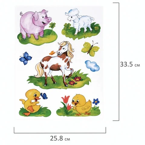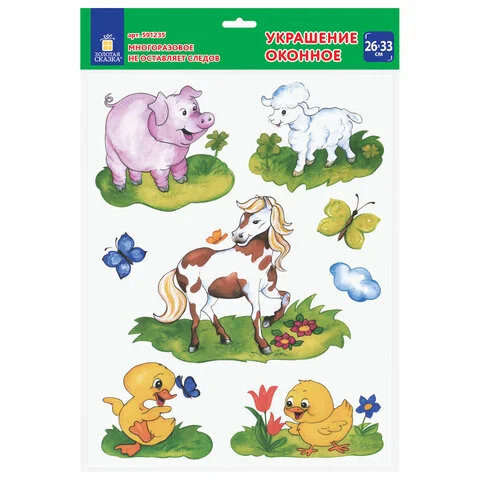 Изделие с изображением забавных зверят представляет собой наклейку на окно/стекло, изготовленную из поливинилхлорида (ПВХ). Наклейка размером 25,8х33,5 см декорирована разноцветным глиттером. Украшение предназначено для декорирования окон, зеркал, стекол и других ламинированных глянцевых поверхностей. Не оставляет клеевых следов и предназначено для многократного использования. Крепится к поверхности посредством статического эффекта. Украшение на белой картонной подложке упаковано в прозрачный полипропиленовый пакет на картонном подвесе.