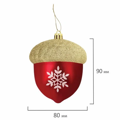 В каждой связке по 3 елочных украшения в виде шишек размером 2,5x6x2,5 см. Представлены в шоу-боксе с 12 отделениями, в двух цветах: золотистый и красный. В каждом 'кармашке' находится связка из 3 шишек одного цвета.