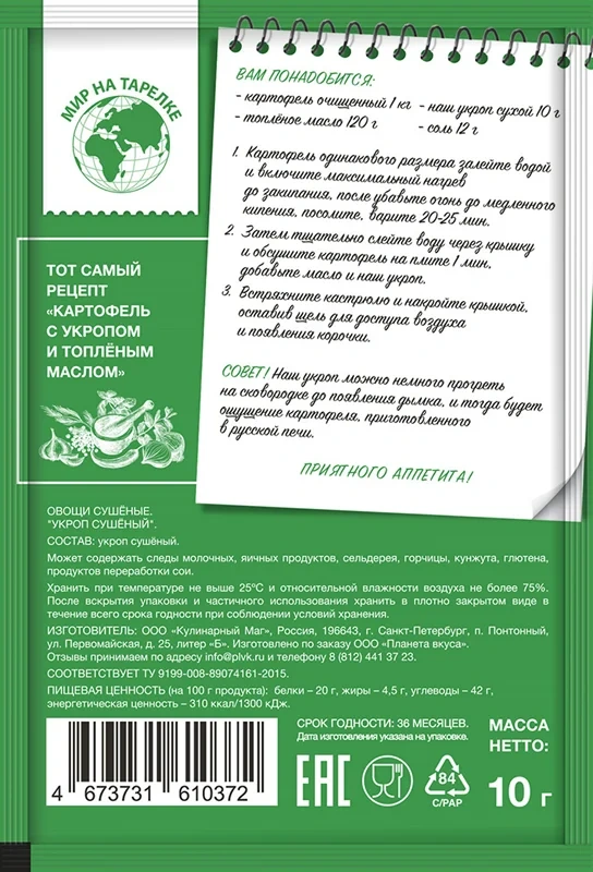 Приправа Укроп сушеный от бренда Мир на тарелке - это честный и открытый состав. Наш укроп производится исключительно из натурального укропа без добавления консервантов, красителей и искусственных ароматизаторов. Вы получаете чистый продукт, полный полезных свойств. Приправа без содержания соли.