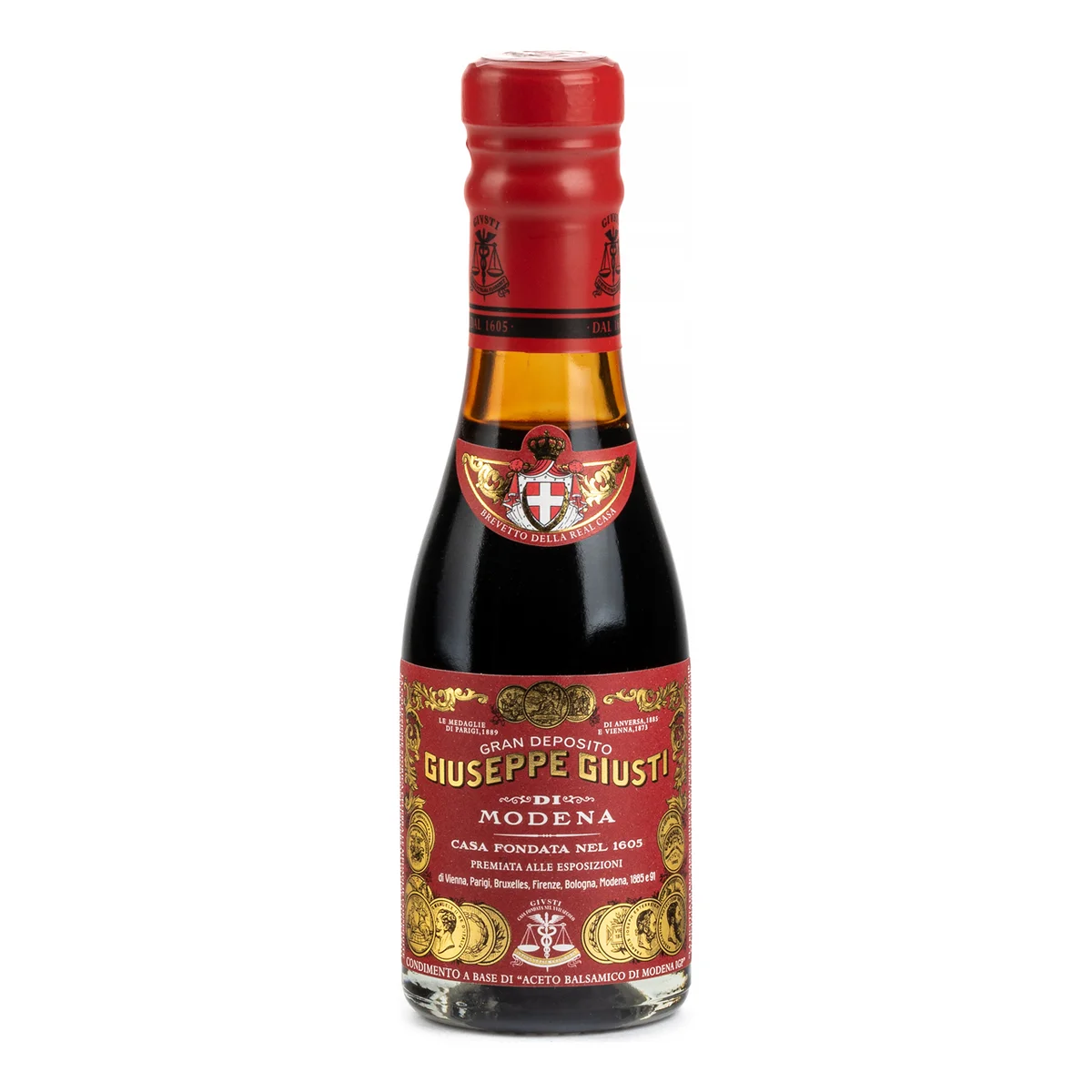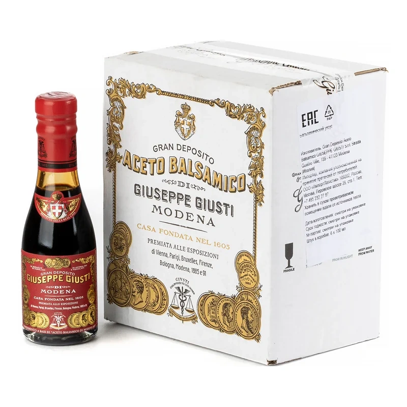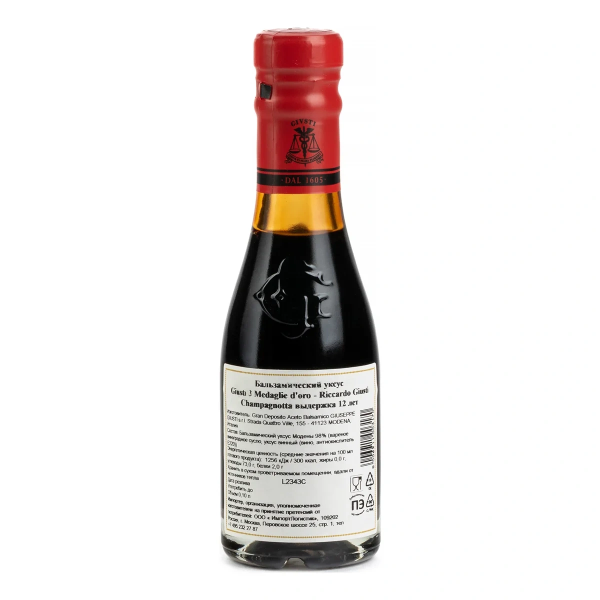 Бальзамический уксус Giusti 1 Medaglia d'argento Il Profumato Champagnotta.1 Серебряная медаль Il Profumato (6 лет). Благодаря выдержке во французских бочках, возраст которых более 100 лет, бальзамический уксус обладает густой консистенцией, богатым фруктовым ароматом, сбалансированным вкусом и длительным послевкусием. Универсальный бальзамический уксус, идеально сочетается с мясом и свежими овощами. Великолепная заправка для салатов. Темный и густой, с нюансами фруктовых джемов, оттенками меда и ванили и печатью королевского дома Савойской династии.