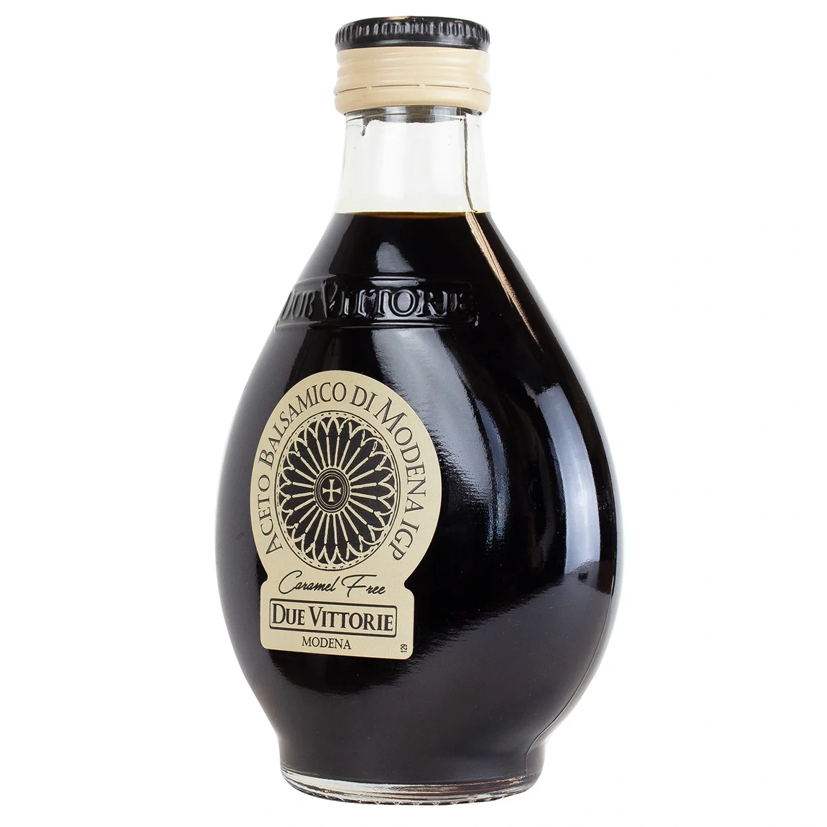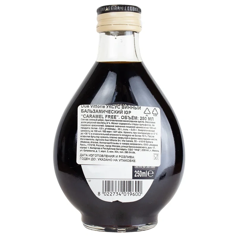 Уксус винный бальзамический IGP “Caramel Free” от Due Vittorie изготавливается всего из двух ингредиентов: 30% вареного виноградного сусла и 70% винного уксуса. Без добавления карамели. Поскольку процент сусла здесь выше, чем в продукте с меньшей плотностью, это позволяет не использовать карамель и сохранить состав максимально натуральным.
