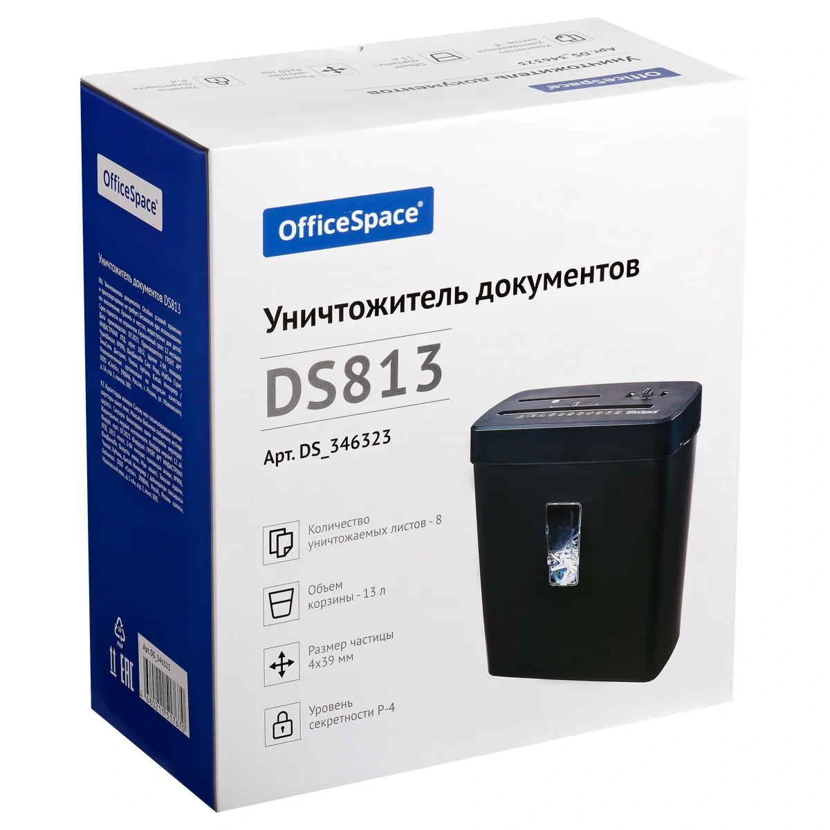 Уничтожитель документов OfficeSpace DS813, 4 ур. секр., 4*39мм, 8 листов, 13л., CD, карты