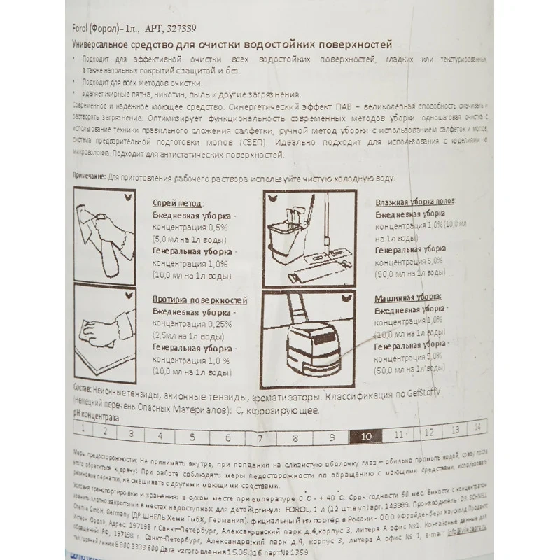 Профессиональное средство Forol от Dr. Schnell предназначено для эффективной очистки всех водостойких, гладких и структурированных напольных покрытий, водостойких полов с покрытием и без покрытия. Подходит для всех методов очистки: повседневной и генеральной уборки, ручной и автоматической уборки, уборки спрей-медотом, уборки с изделиями из микроволокна и одношаговой очистки с использованием техники правильного сложения салфетки.