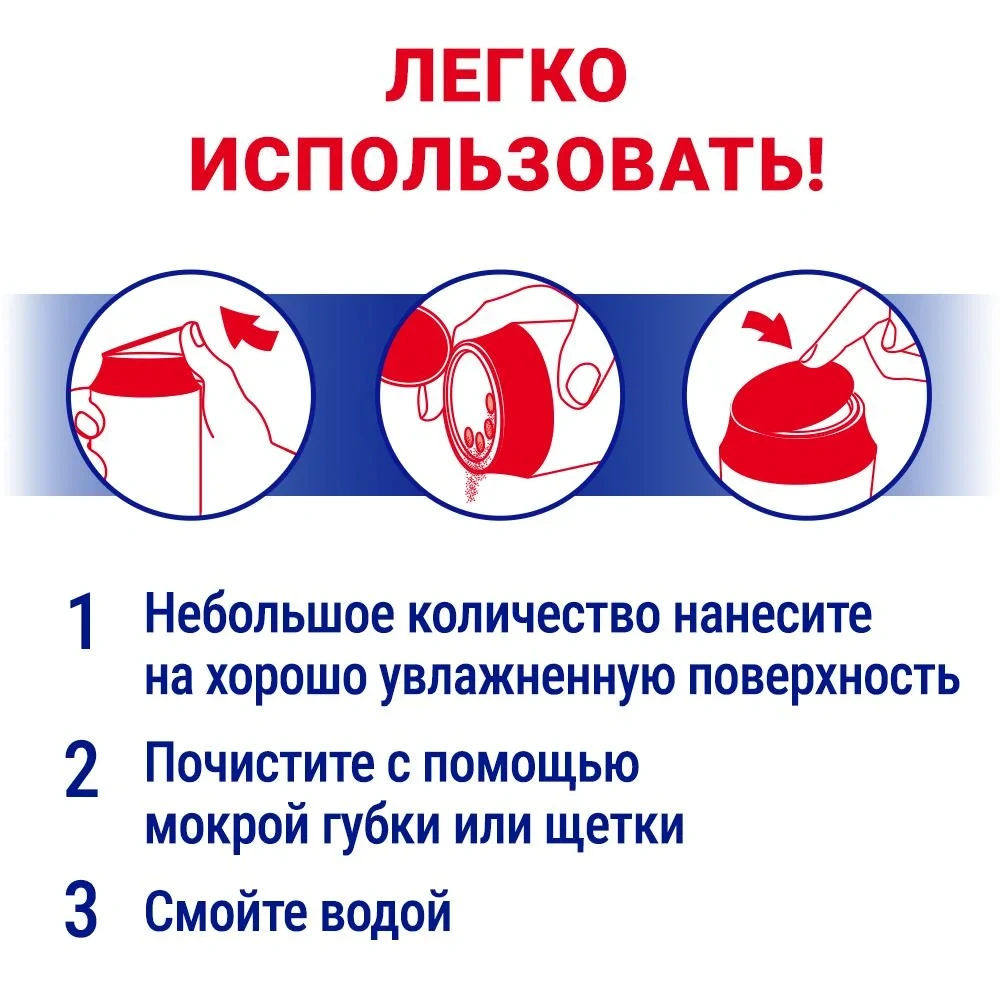 Применение: нанесите на влажную поверхность, почистите и смойте водой. Продукт может слеживаться. Встряхните упаковку перед первым использованием.
