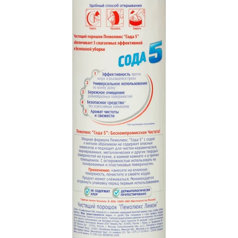 Мощная формула ПЕМОЛЮКС с содой и мягким абразивом подходит для чистки керамических, эмалированных, металлических и других твердых поверхностей на кухне, в ванной комнате и прочих помещениях. С осторожностью использовать на полированных и пластиковых поверхностях. Не предназначен для чистки поверхностей, контактирующих с пищей.
