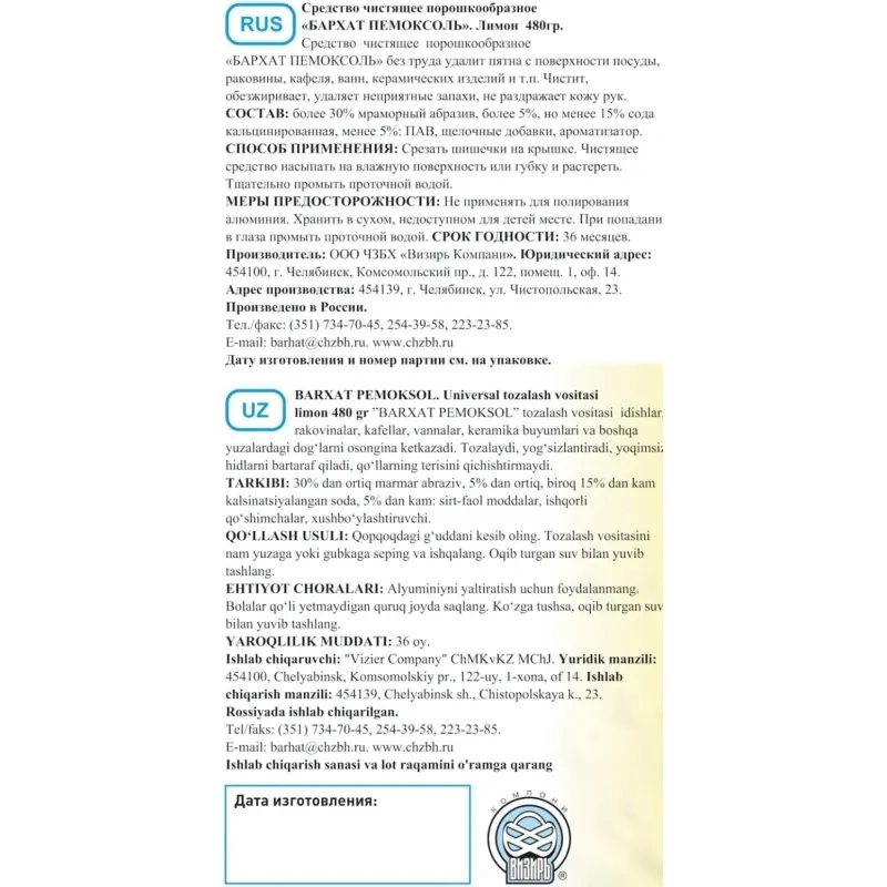 Универсальное чистящее средство Бархат Пемоксоль Лимон порошок 0,48 кг