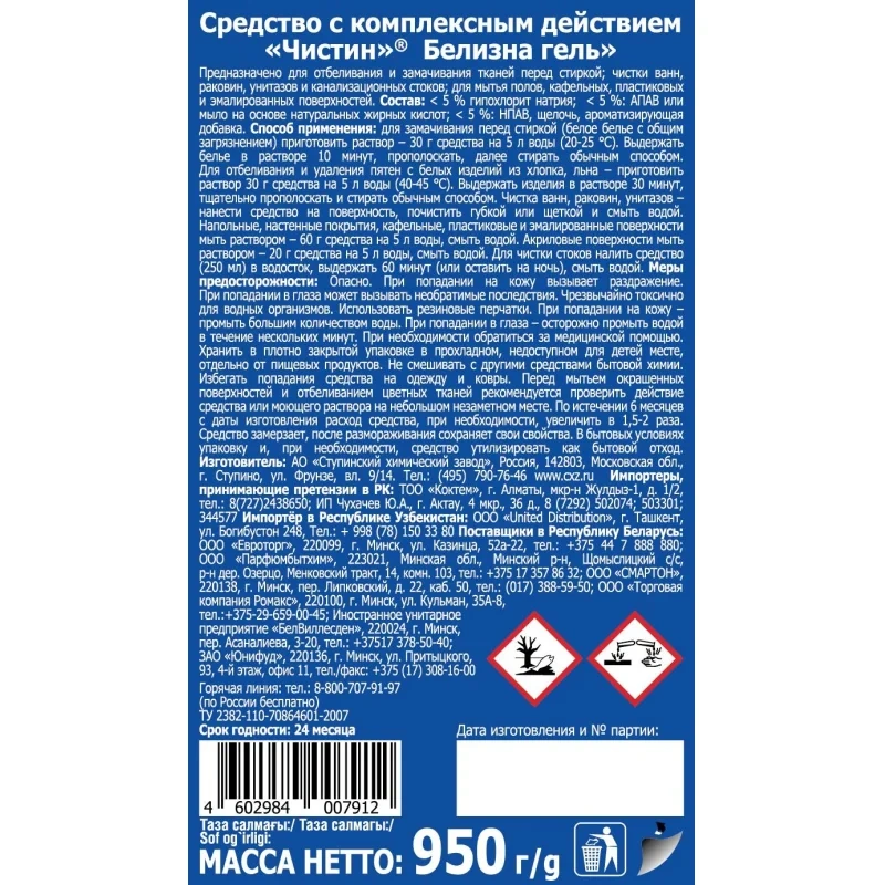 Универсальное чистящее средство Ступинский Химзавод Белизна-гель 950мл, для сантарных зон