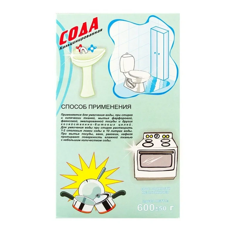 Сода Кальцинированная — моющее водосмягчающее средство, применяется для умягчения воды, мытья фарфоровой, фаянсовой, эмалированной посуды и других хозяйственно-бытовых целей.
