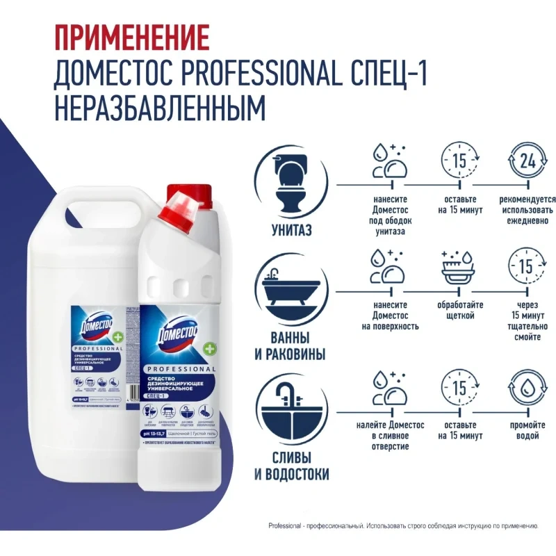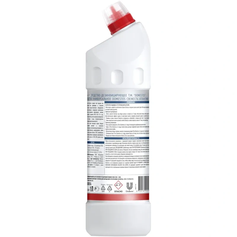 Назначение: средство универсально и подойдет для уборки всего дома. В неразбавленном виде средство можно использовать для очищения и дезинфекции унитаза, ванны, раковины, стоков и сливов, а в разбавленном — для мытья множества поверхностей (пол, кафельные поверхности, плитка, рабочие поверхности на кухне, мусорные ведра) и даже для отбеливания белья и тканей. А универсальное средство Domestos подходит для септиков. Ознакомьтесь с инструкцией по применению для каждого вида поверхностей. Благодаря особой формуле с дезинфицирующим эффектом и чистящими компонентами, Domestos убивает все известные микробы, максимально очищает грязь и устраняет неприятные запахи. Уникальная формула геля Domestos предотвращает появление известкового налета. Густая текстура геля Domestos обеспечивает очищение и убивает бактерии, грибки, вирусы и споры. Изогнутый дозатор обеспечит удобство использования. Регулярно используйте Domestos для постоянной чистоты и белизны вашего туалета и других поверхностей, а также для защиты вашей семьи.