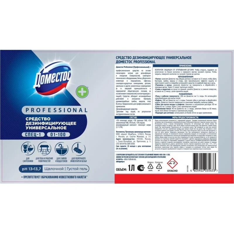 Универсальное чистящее средство Доместос Professional СПЕЦ 1 1л, гель, 608136