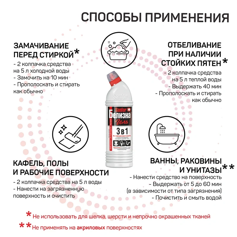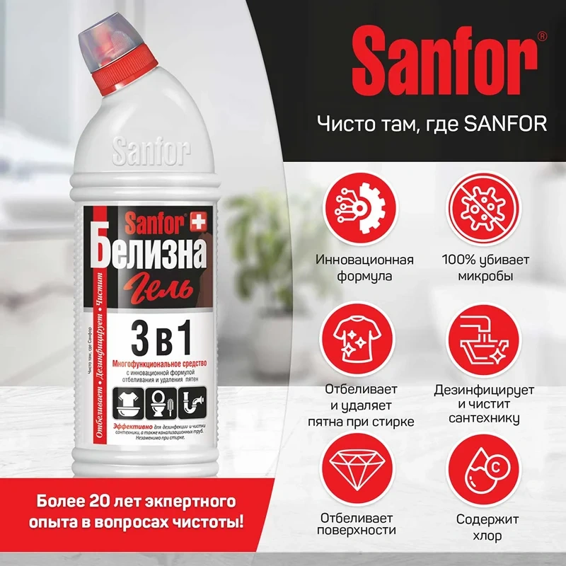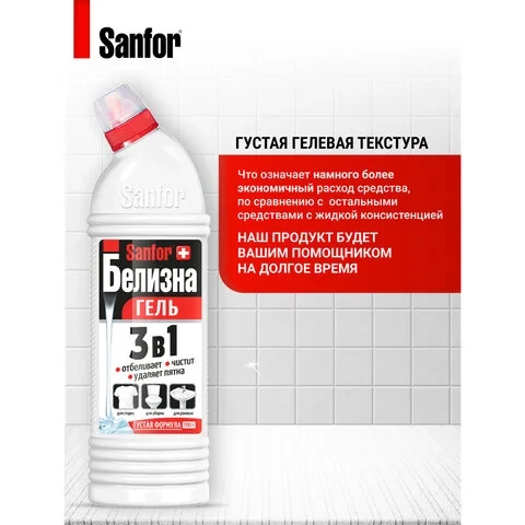 Средство чистящее Sanfor Белизна гель 3в1 Многофункциональное 700г прекрасно подойдет для прочистки труб, удаления ржавчины на поверхности унитаза, отбеливания белья и одежды, мытья и дезинфекции полов. Благодаря мощной инновационной формуле с хлором оно эффективно справляется с грязью, плесенью, известковым налетом, микробами и пятнами на тканях, а также устраняет неприятные запахи. Густая гелеобразная консистенция обеспечивает экономичный расход. Флакон имеет антискользящую поверхность, благодаря чему не выскользнет даже из мокрых рук. Косое горлышко позволяет без труда наносить гель в труднодоступные места (к примеру, под ободок унитаза).