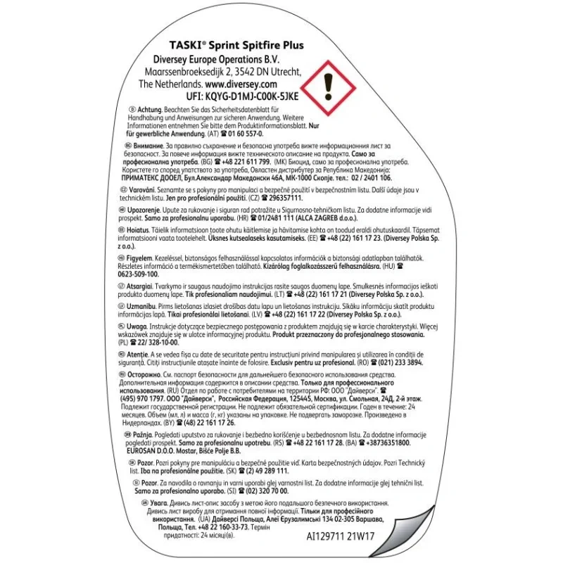 Средство Diversey Taski Sprint Spitfire Plus 750 мл Назначение: высокоэффективное щелочное моющее средство для большинства устойчивых к воздействию щелочи твердых поверхностей. Эффективная глубокая очистка устойчивых к воздействию щелочи поверхностей. Одновременное удаление жира и масел, а также трудновыводимых пятен. Готово к применению, не требует ополаскивания, не оставляет полос и разводов. Запатентованная технология ONT разрушает молекулы, создающие неприятный запах. Способ применения: При обработке легких загрязнений: Распылить средство на салфетку/губку и нанести на поверхность. При необходимости оставить на время, чтобы средство подействовало, и вытереть дочиста. При выведении устойчивых пятен: Распылить средство непосредственно на поверхность и оставить на некоторое время (1 минуту), чтобы средство подействовало. Затем протереть при необходимости, и вытереть дочиста. Не использовать при обработке поверхностей, чувствительных к воде и щелочи, а также не обрабатывать окрашенные поверхности. Не использовать для обработки поверхностей, контактирующих с пищевыми продуктами, а также для чистки алюминия. Перед применением всегда проверять совместимость средства с обрабатываемым материалом на маленьком, незаметном участке. Состав: вода (мягкая), карбонат натрия, метасиликат натрия, алкилбензолсульфокислота, гидроксид натрия, бутиловый эфир этиленгликоля, алкил (C12-14) (3EO) серная кислота, натриевая соль, этоксилат спирта (C 9-11), метилглициндиуксусная кислота 3Na-соль, краситель, отдушка. Срок годности: 2 года с момента производства (при соблюдении условий хранения, рекомендованных производителем).