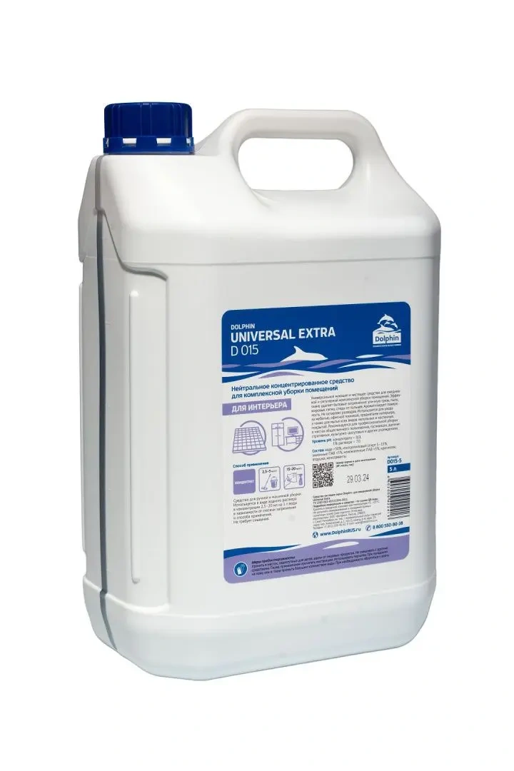 Нейтральное средство для комплексной уборки помещений Dolphin Universal Extra D015 5 лНазначение: для ежедневного и периодического ухода за мебелью, офисной техникой, предметами интерьера. Может применяться для мытья всех видов напольных и настенных поверхностей. Область применения: рекомендуется к применению в местах общественного пользования. Свойства: существенно облегчает уборку бытовых загрязнений — пыли, грязи, жировых пятен, следов от пальцев. Ароматизирует поверхность и уменьшает дальнейшее прилипание пыли. Не оставляет разводов. Способ применения: используется в виде водного раствора в концентрации 2,5-5 мл / 1 л воды в зависимости от степени загрязнения. Не требует смывания. Применяется для ручной и машинной уборки.Состав: изопропиловый спирт 5-15%, анионные ПАВ 0-5%, неионогенные ПАВ 0-5%, красители, отдушка, консерванты. ГОСТ/ТУ: ТУ 2383-002-85522504-2011.Плотность: 0,99 г/куб.см. при 20°С.Значение pH 1%-раствора: 7.Меры предосторожности (подробная информация см. паспорт безопасности): не смешивать с другими средствами, перед применением прочесть инструкцию. Использовать перчатки. При попадании на кожу или в глаза промыть большим количеством воды. При необходимости обратиться к врачу.Условия хранения: хранить в заводской упаковке при температуре 5-25°С. Не допускать замораживания и попадания прямых солнечных лучей. Хранить в местах недоступных для детей, вдали от пищевых продуктов.Срок годности: 24 месяца (с даты производства).