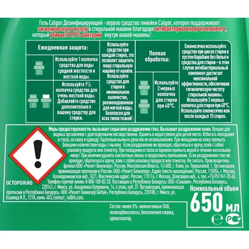 Средство для удаления накипи Calgon антибактериальный гель 650 мл Назначение: Средство дезинфицирующее Calgon Гель для смягчения воды в стиральных машинах - первое средство линейки Calgon, которое поддерживает гигиеническую чистоту в стиральной машине благодаря антибактериальному компоненту, который убивает 99.99% бактерий внутри вашей машины. Безопасен для ткани. Защищает стиральную машину от накипи. Рекомендован ведущими производителями стиральных машин. Способ применения: Ежедневная защита: добавляйте 1 колпачок Calgon при стирке, если вода средней жесткости или жесткая. Добавляйте 1 2/3 колпачка Calgon при стирке, если вода очень жесткая. Добавляйте Calgon при каждой стирке, поверх средств для стирки. Дозируйте количество стирального порошка согласно инструкции для мягкой воды. Безопасен для всех видов тканей. Полная обработка: ежемесячно используйте средство при цикле средства в пустом барабане без белья и средства для стирки - в этом случае антибактериальный компонент достигает максимальной эффективности, обеспечивая гигиеническую чистоту стиральной машины. Используйте ежемесячно или после каждых 15 стирок. Меры предосторожности: Вызывает серьезное раздражение глаз. Вызывает раздражение кожи. Вредно для водных организмов с долгосрочными последствиями. Избегать попадания в глаза, на кожу и одежду. Тщательно вымыть руки после использования. При попадании на кожу промыть большим количеством воды с мылом. Если раздражение не проходит, обратиться к врачу, взяв с собой упаковку продукта или этикетку. При попадании в глаза осторожно промыть водой в течение нескольких минут. При наличии удалить контактные линзы и продолжить промывание. Если раздражение глаз не проходит, обратиться к врачу, взяв с собой упаковку продукта или этикетку. Не глотать. Состав: Менее 5%: неионогенные ПАВ, поликарбоксилаты, бензалкония хлорид, ароматизатор. Условия хранения: Хранить в недоступном для детей месте. Срок годности: 24 месяца.