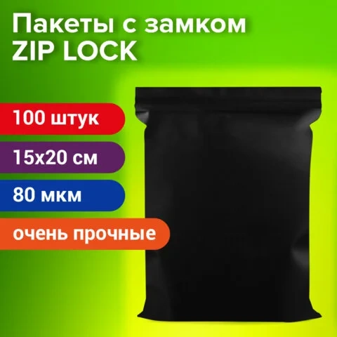 Пакеты с замком Zip Lock Brauberg Очень прочные 15х20см, черные, 80мки, ПВД, 100шт/уп