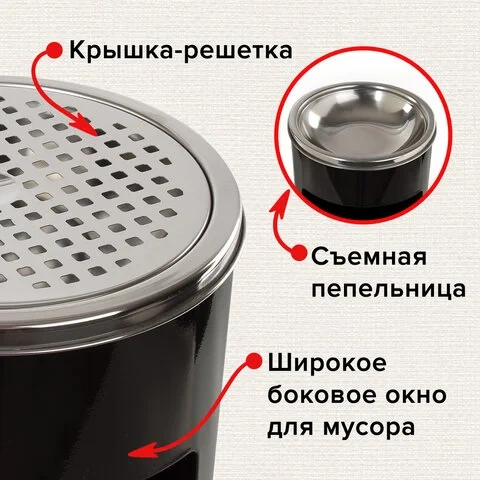 Урна выполнена из нержавеющей стали черного цвета и имеет объем 27 л. Снабжена пепельницей с крышкой для предотвращения попадания горящих окурков и пепла внутрь урны. Боковое окно урны позволяет бросать более крупный мусор. Размер урны - 250х250х600 мм.