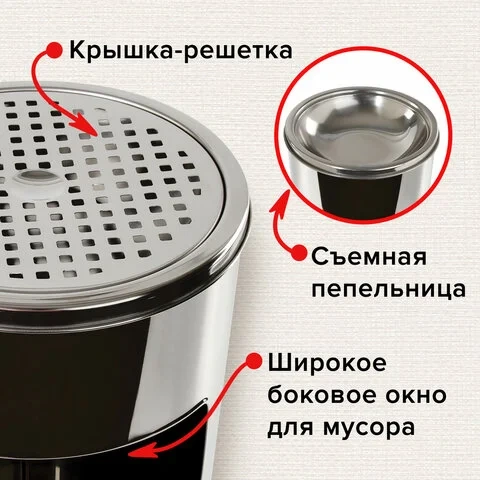 Урна выполнена из зеркальной нержавеющей стали и имеет объем 27 л. Снабжена пепельницей с крышкой для предотвращения попадания горящих окурков и пепла внутрь урны. Боковое окно урны позволяет бросать более крупный мусор. Размер урны - 250х250х600 мм.