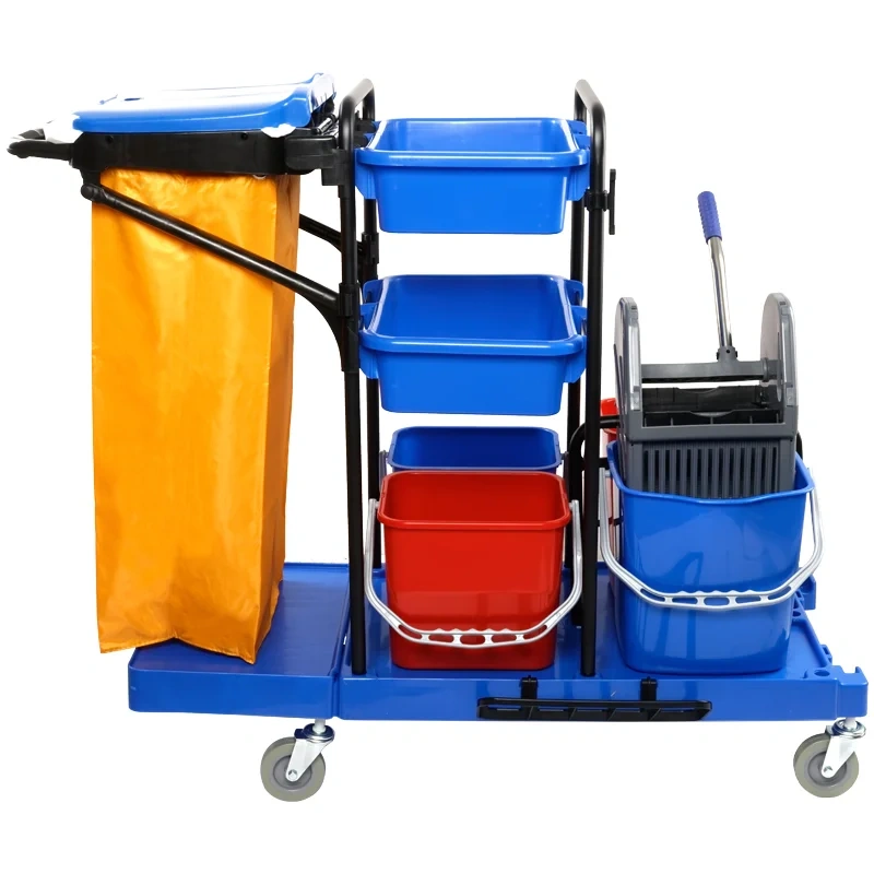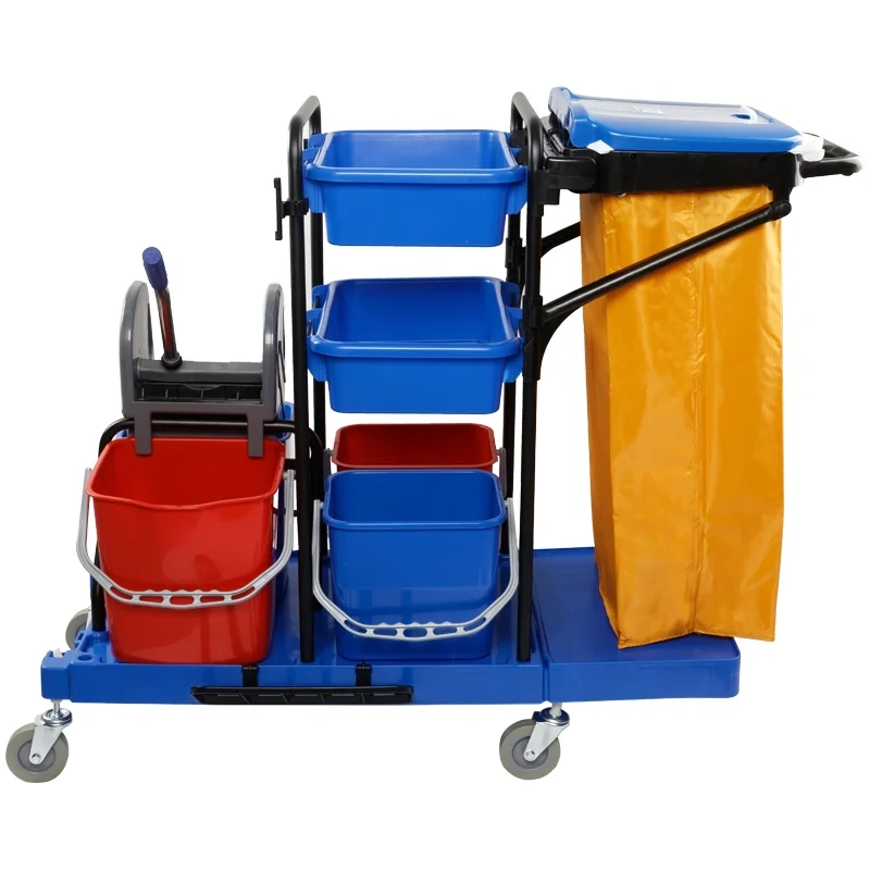 Многофункциональная уборочная тележка предназначена для проведения комплексной уборки в помещениях. Оснащена четырьмя ведрами разного объема, механическим отжимом, мешком многоразового использования, держателями для МОПов и швабр