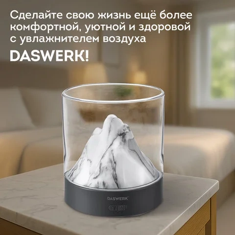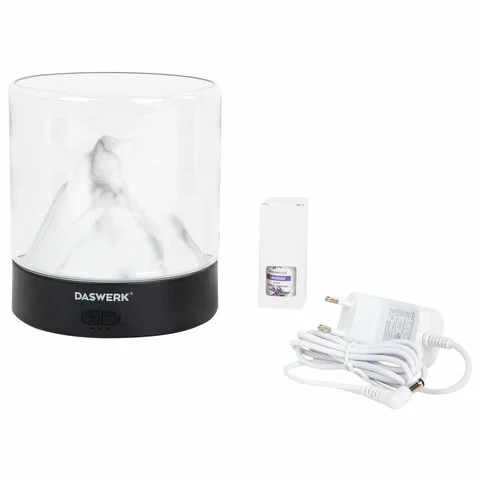 Увлажнитель воздуха DASWERK прост в использовании и обслуживании. Он работает сети. Объем резервуара для воды – 300 мл, что обеспечивает непрерывную работу в течение нескольких часов, так как увлажнитель распыляет воду со скоростью 20 мл/ч.
