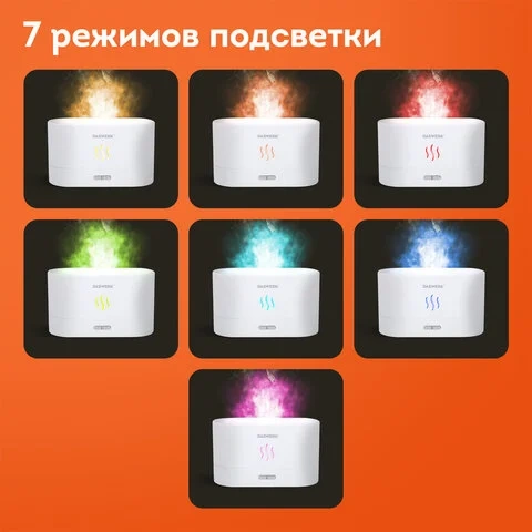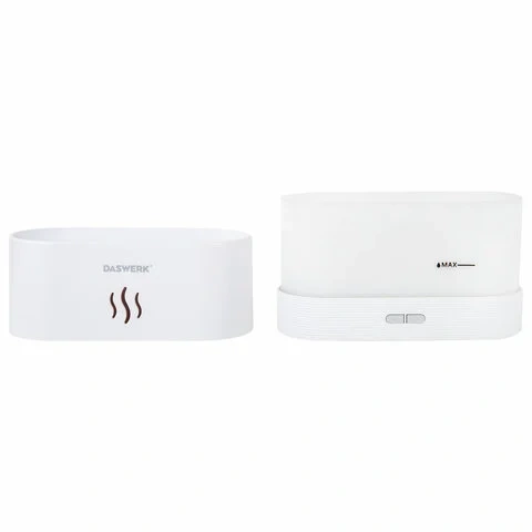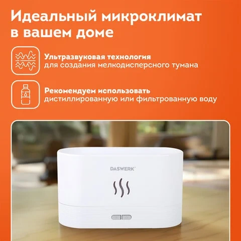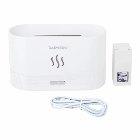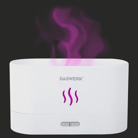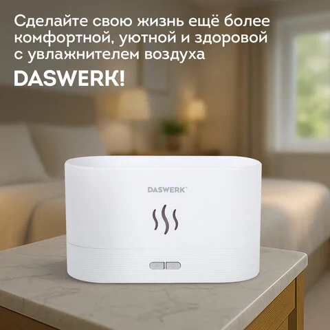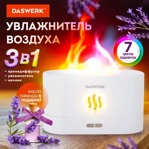 'Увлажнитель воздуха DASWERK соединяет в себе несколько устройств: увлажнитель, аромадиффузор и ночник. Принцип его работы основан на ультразвуковом воздействии, которое превращает воду в мелкодисперсный туман. Благодаря подсветке создается эффект пламени. Подсветка имеет 7 цветов, которые можно менять, нажав на кнопку на корпусе. При добавлении эфирного масла в воду, можно создать благоприятную и уютную атмосферу в доме. В комплекте уже есть ароматическое масло с запахом лаванды.