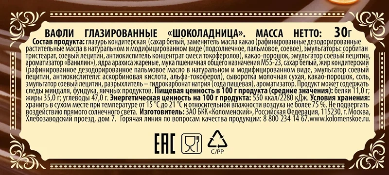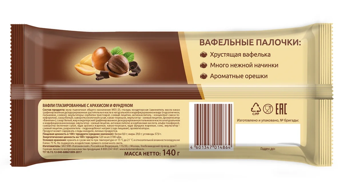 Вафли Коломенское Глазированные с арахисом и фундуком, 140г