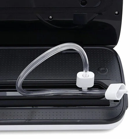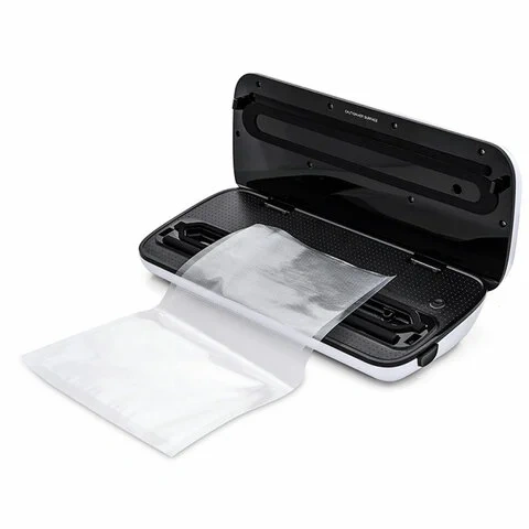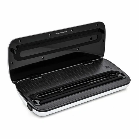 В комплекте идут вакуумные пакеты, рулон плёнки и шланг для откачивания воздуха из контейнеров. Компактные размеры (366x154x77 мм) и вес всего 1,3 кг позволяют легко хранить устройство на кухне.