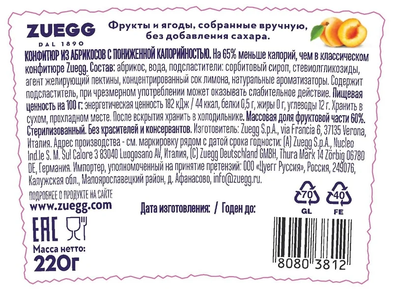 Конфитюр Zuegg Абрикос без сахара, 220г