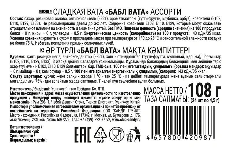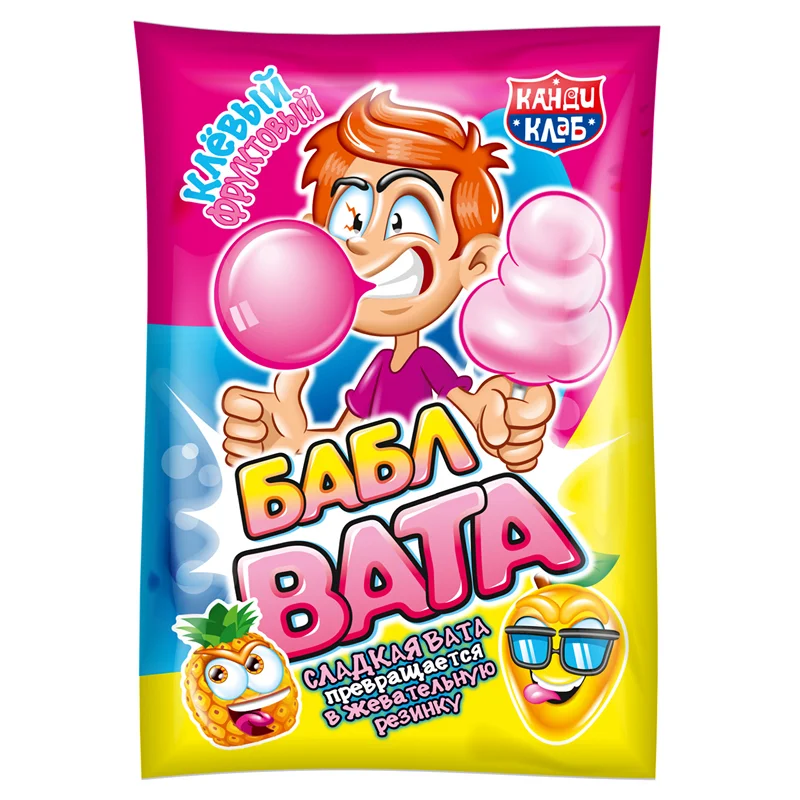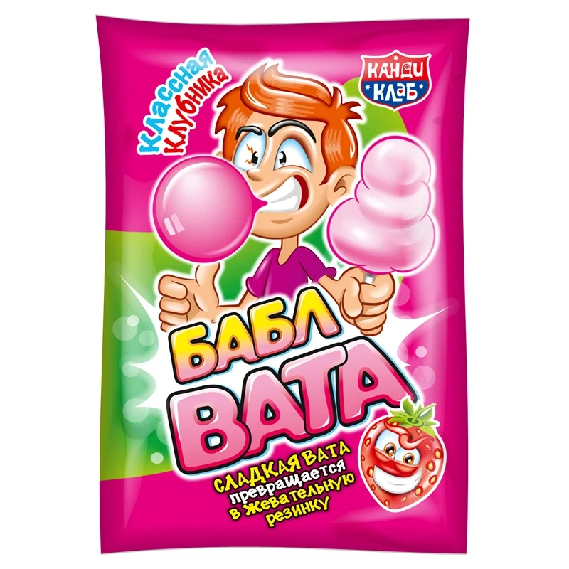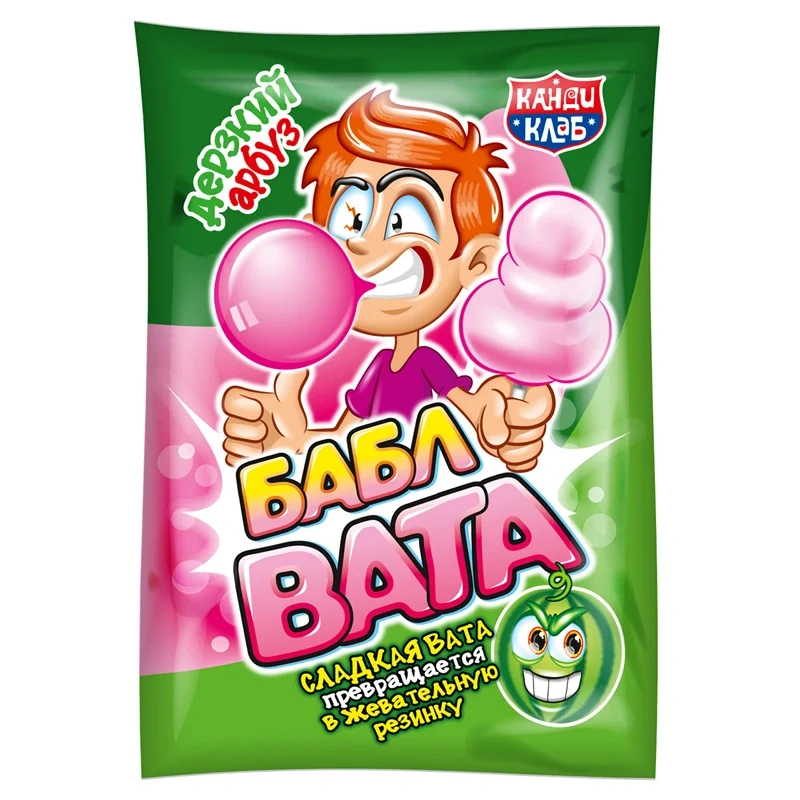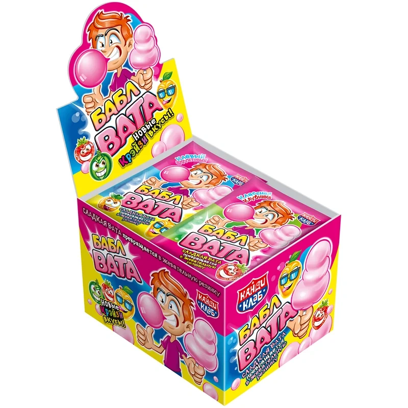 Жевательная резинка Сладкая вата - лидер продаж в сегменте детской кондитерской продукции, совмещает в себе наслаждение вкуса сладкой ваты переходящей в жевательную резинку. Яркий вкус сохраняется продолжительное время. В одном блоке представлены четыре популярных среди детей вкуса. Отличается от других своим разнообразием вкусовых наполнителей. Позволяет насладиться ее вкусом всем дружным семейством или на вечеринке с друзьями. Представлена в следующих вкусах: клубника, арбуз, кола, тутти-фрутти. Не рекомендовано детям до 3-х лет.