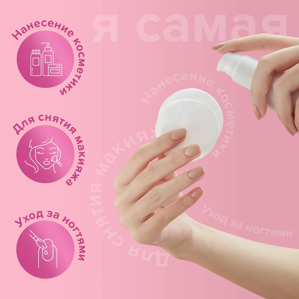Ватные диски Я самая, 120 штук – идеальный вариант для современных женщин и девушек. Изготовленные из натурального, 100% хлопка, двухсторонние диски станут незаменимыми помощниками при снятии макияжа или лака для ногтей. Также они помогут бережно и деликатно ухаживать за кожей лица, поскольку обладают нежной текстурой. С их помощью очень удобно протирать кожу лосьоном, наносить крем и тональную основу. Можно использовать для гигиенических процедур для малышей в дороге и дома, поскольку в состав ватных дисков не включены синтетические вещества, которые могут вызвать аллергию. Пористая сторона диска предназначена для нанесения жидкости на кожу и очищения, другая, ребристая, способствует равномерному нанесению косметического средства на поверхность кожи.