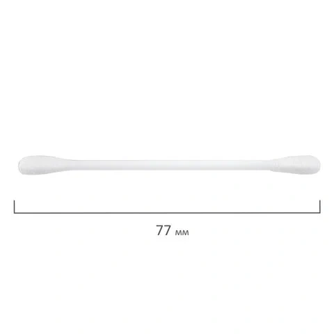 Имеют плотную намотку, что не позволяет отслаиваться волокнам при использовании. Производятся из 100% хлопка. Двусторонние ватные палочки длиной 77 мм имеет специальную форму с ограничителем. Выполнены в белом цвете. Упругая пластиковая палочка не гнется при использовании. Удобный пластиковый стакан для хранения содержит 200 штук.