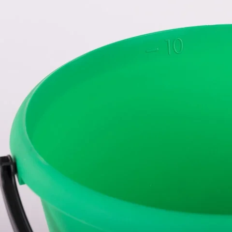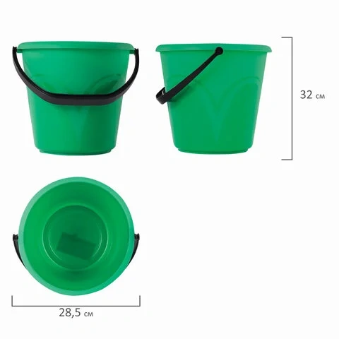 Объем - 10 л. Оснащено перекидной ручкой для удобства переноски. Верхняя кромка ведра загнута наружу, что позволяет захватывать его и переносить без помощи ручки. Ведро круглой формы изготовлено из высокопрочного пластика. Размер - 32х28.5х28.5 см.
