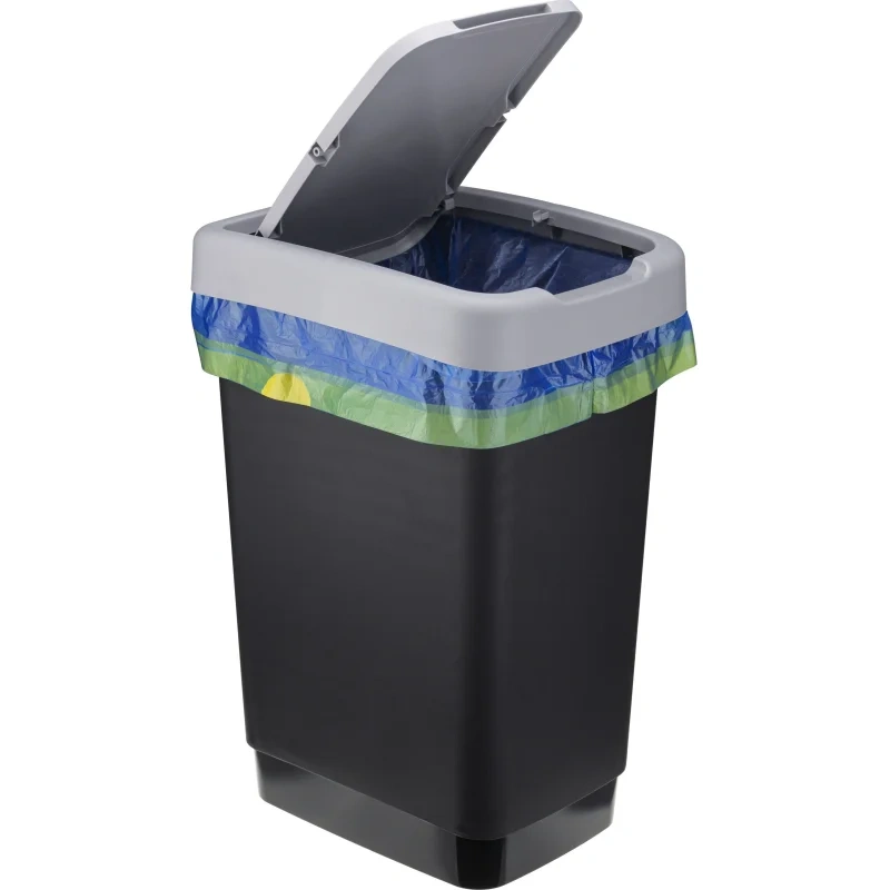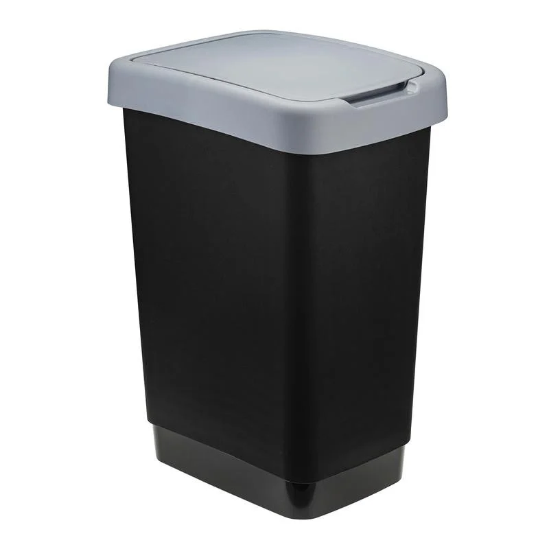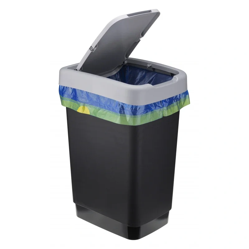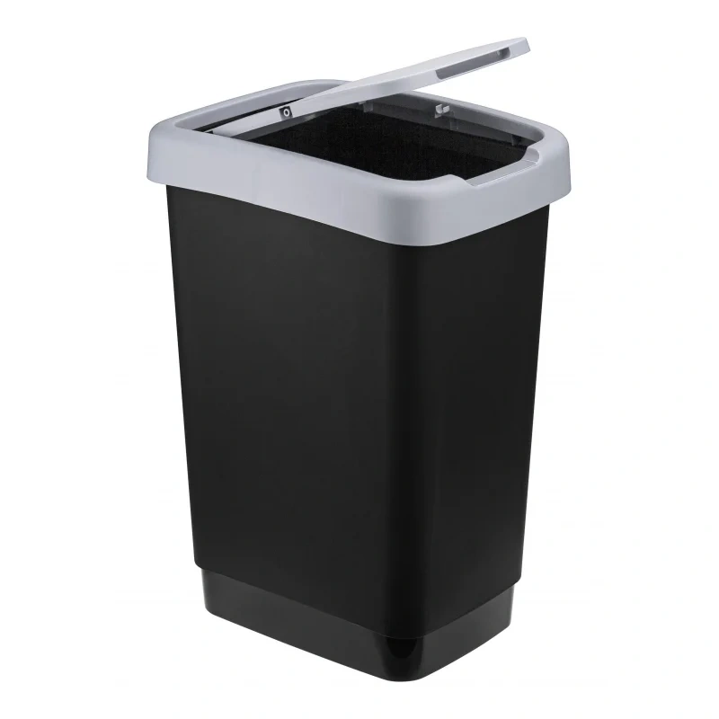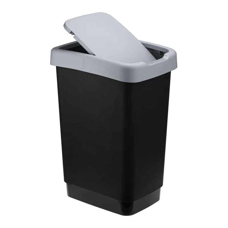 Прямоугольное мусорное ведро Idea Twin выполнено из высококачественного пластика. Отличный вариант для дома, офиса и общественных заведений. Ведро для мусора Twin состоит из: черного мусорного бака, который можно застилать пакетом для мусора. серой крышки, которая фиксирует мусорный пакет и позволяет легко и быстро опустошить ведро и помыть его. Верхняя часть крышки — подвижная. Она проваливается при надавливании на переднюю ее часть. Крышка поднимается, если толкнуть вверх ручку-выступ. При необходимости, подвижная часть крышки может быть зафиксирована в вертикальном положении. Размер ведра: 47×26×33 см. Цвет: ведра — черный, крышки — серый. Высота без крышки 44 см. Вес: 0.9 кг.