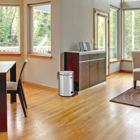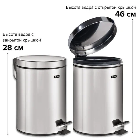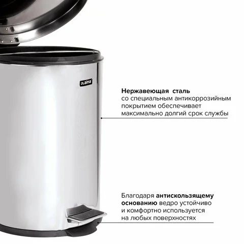 5 л - подходящий объем при небольшой проходимости. Оборудовано педалью для открывания. Крышка плотно прилегает, тем самым препятствуя распространению запахов. Внутреннее съемное пластиковое ведро имеет удобную рукоятку для извлечения. Изготовлено из нержавеющей стали со специальным антикоррозийным покрытием, что обеспечивает максимально долгий срок службы. Ведро устойчиво благодаря антискользящему основанию. Объем рекомендуемого мешка - 10 л. Контейнер для мусора в стальном цвете с зеркальным покрытием имеет компактные размеры (28х20,5х20,5 см) и отлично впишется в любой интерьер.