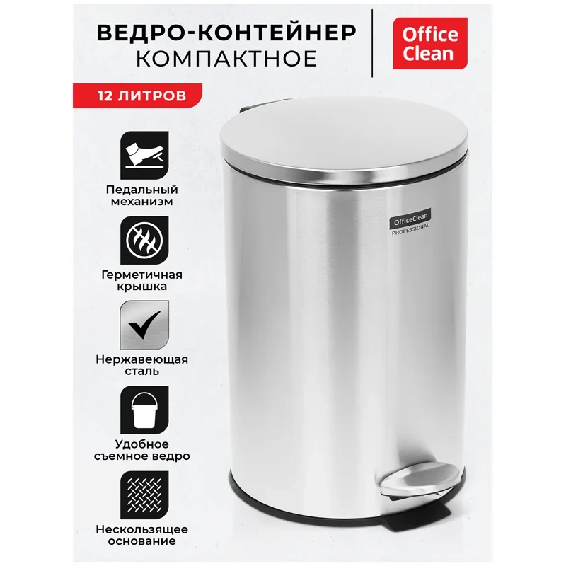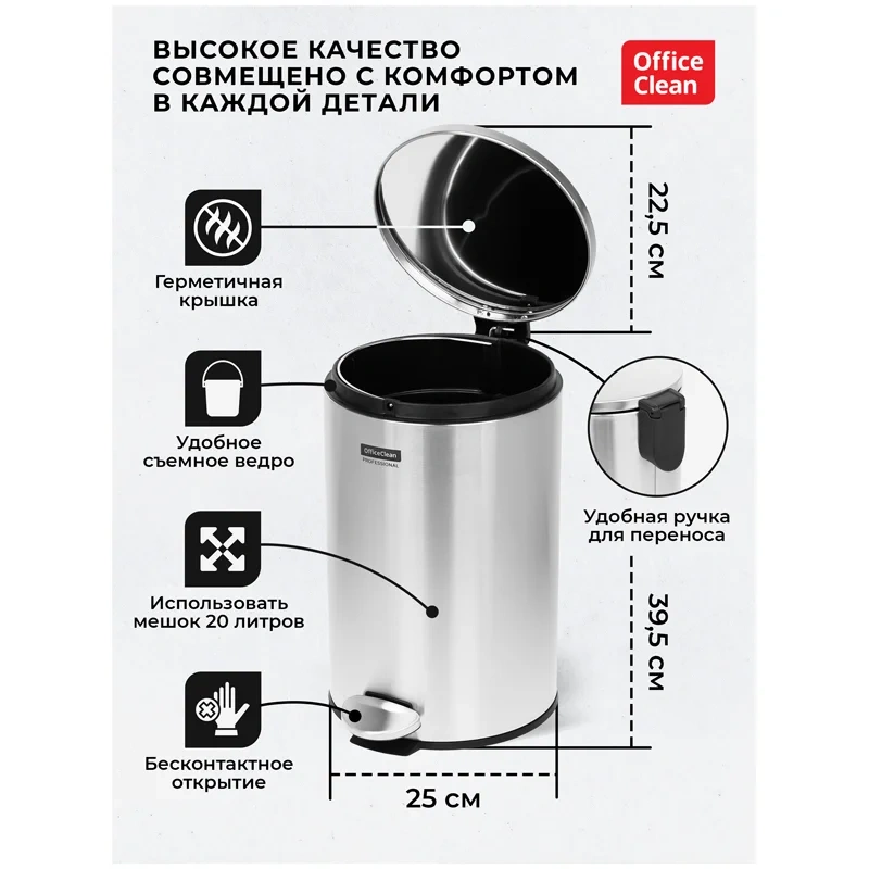 Ведро - контейнер OfficeClean - отличный вариант для поддержания чистоты и гигиены на кухне, в санузле, в офисах, заведениях общественного питания. Корпус контейнера вместе с крышкой изготовлен из нержавеющей стали. Крышка плотно прилегает, тем самым препятствуя распространению запахов. Внутреннее съемное пластиковое ведро имеет удобную рукоятку для извлечения. Контейнер устойчив благодаря антискользящему основанию. Отвечает всем требованиям гигиены. Рекомендуемый объем мешка 20л.