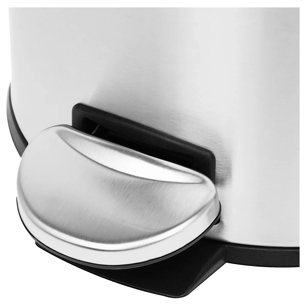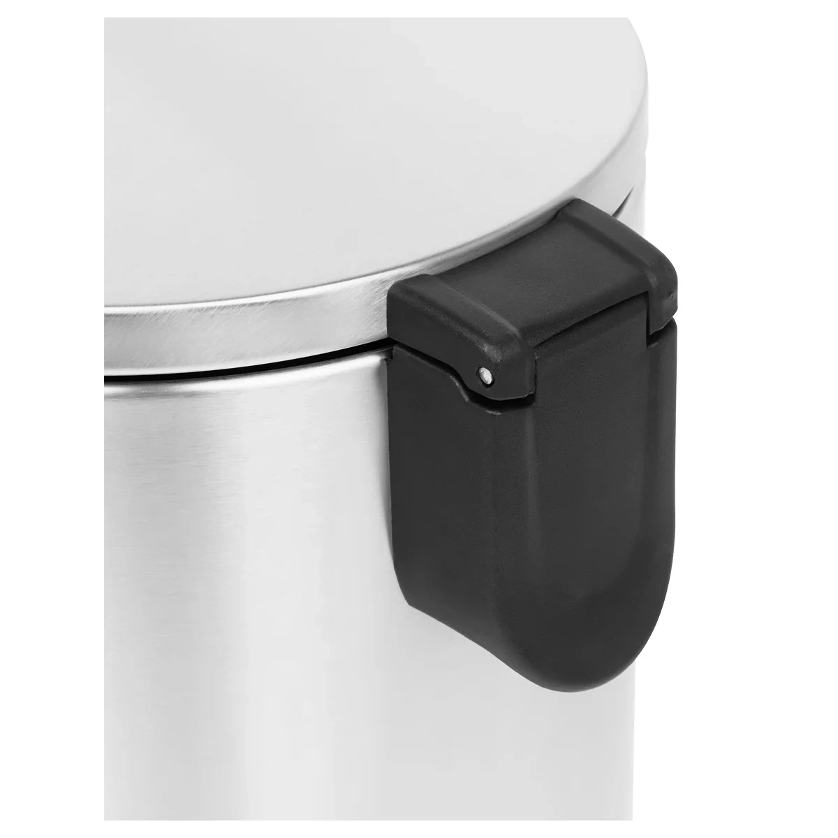 Корпус контейнера вместе с крышкой изготовлен из нержавеющей стали. Педаль помогает открыть крышку, которая плотно прилегает, тем самым препятствуя распространению запахов. Внутреннее съемное пластиковое ведро имеет удобную рукоятку для извлечения. Контейнер устойчив благодаря антискользящему основанию. Ведро отвечает всем требованиям гигиены. Рекомендуемый объем мешка – 10л.