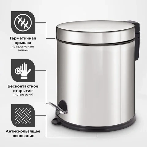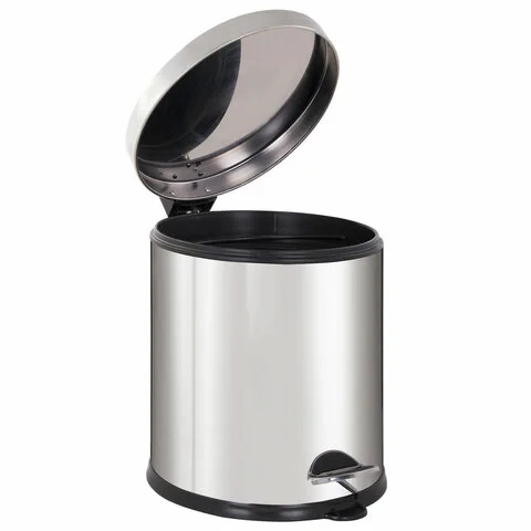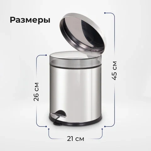 5 л - подходящий объем при небольшой проходимости. Оборудовано педалью для открывания. Крышка плотно прилегает, предотвращая распространение запахов. Внутреннее съемное пластиковое ведро имеет удобную ручку для извлечения.