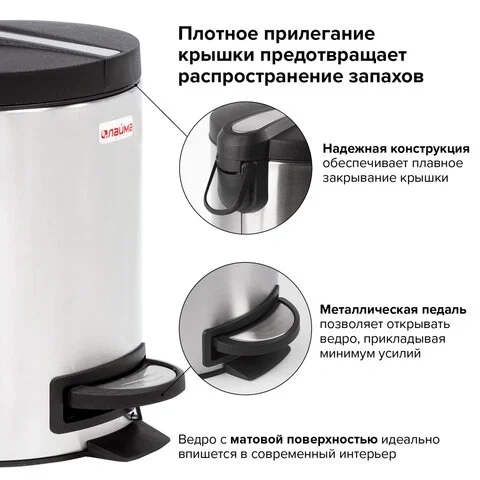 Ведро-контейнер для мусора (урна) с педалью ЛАЙМА 'Modern', 5 л, матовое, нержавеющая сталь, 606301