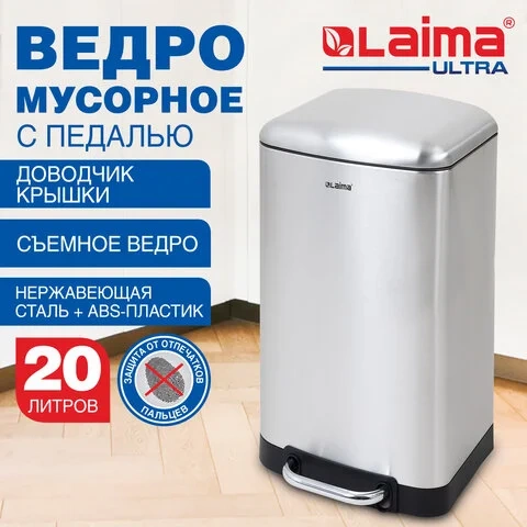 Ведро мусорное с педалью 20 л, крышка с доводчиком, стальное, БЕЗ ОТПЕЧАТКОВ, LAIMA ULTRA, 701570