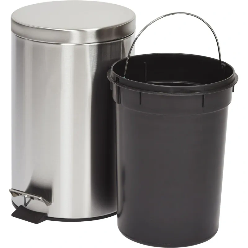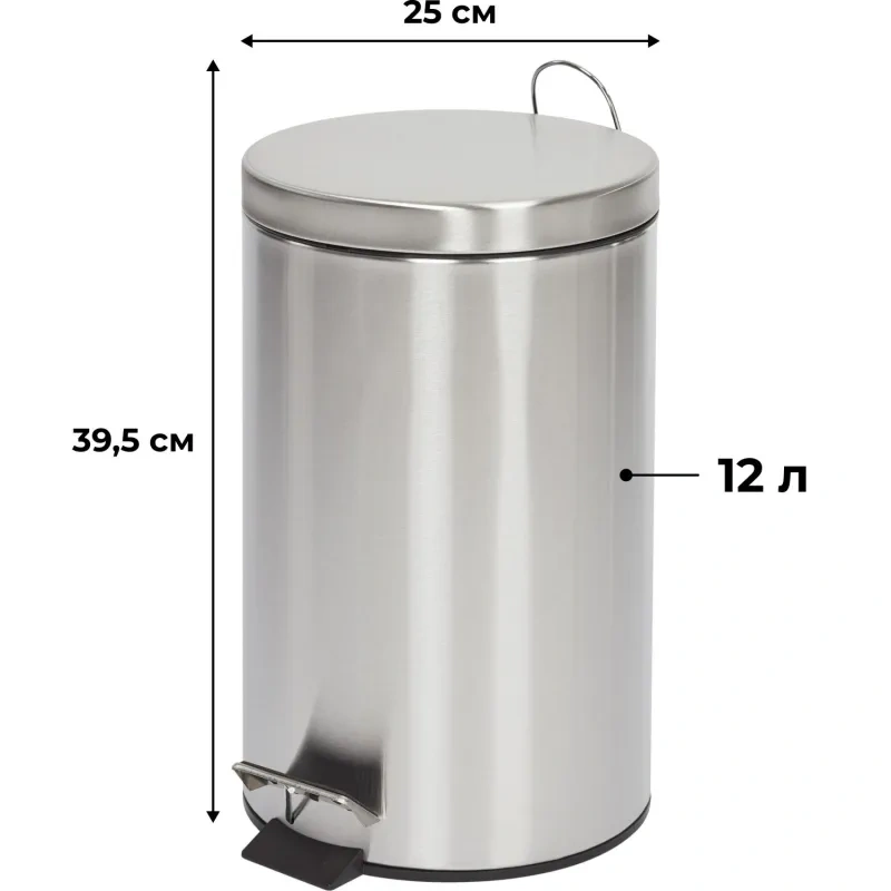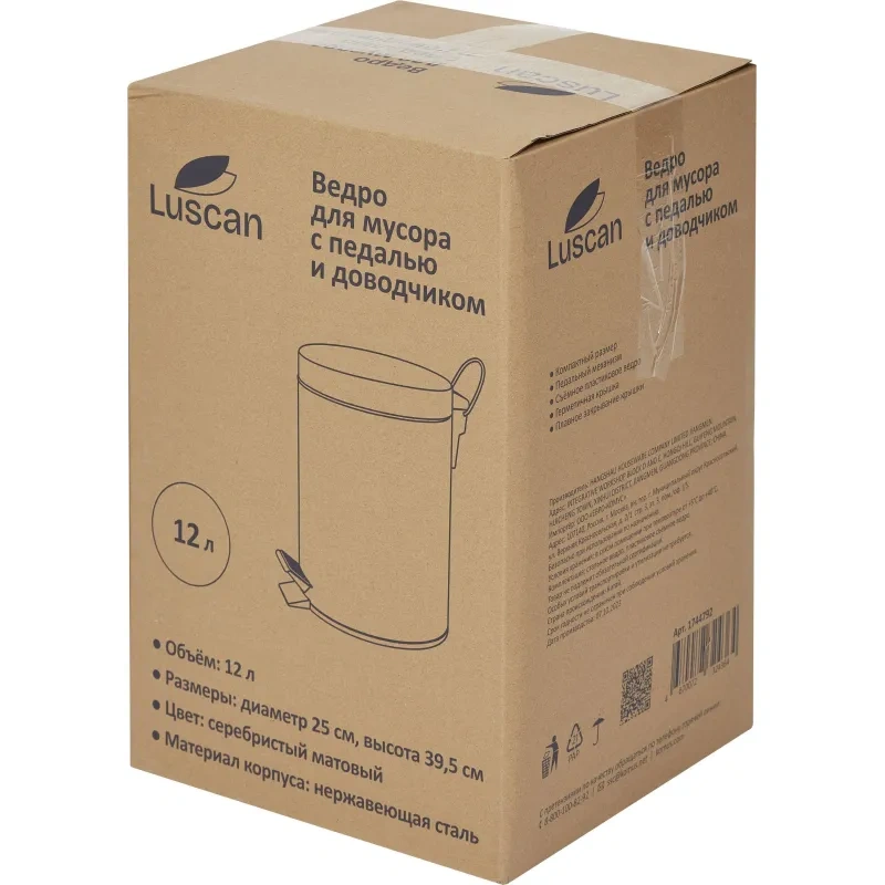 Ведро мусорное Luscan 12 л нержавеющая сталь с педалью с крышкой серебристое (39.5x25x25 см). Круглое ведро Luscan с педалью и доводчиком предназначено для сбора бытового мусора. Корпус выполнен из нержавеющей стали. Съемное внутреннее пластиковое ведро оснащено ручкой для переноски. Механизм доводчика обеспечивает тихое и плавное закрывание крышки. Наличие педального механизма позволяет не соприкасаться с конструкцией ведра руками. Герметичная крышка плотно прилегает к баку. Подходит для использования как в помещении, так и на улице. Комплектация: стальное ведро, пластиковое съемное ведро. Объем: 12 л. Размер контейнера: высота - 39.5 см, диаметр - 25 см. Цвет: серебристый. Вес: 1.75 кг. Внимание: в характеристике 'Объем рекомендуемого мешка' указан минимальный объем мешка, который подойдет для изделия. Рекомендуется приобретать мешки указанного, либо большего объема.