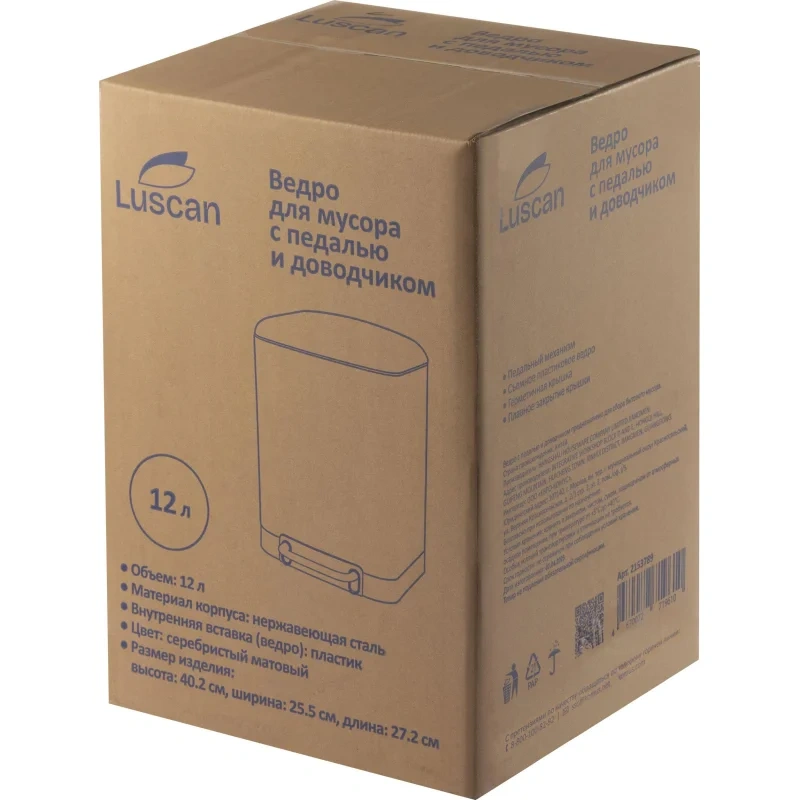Ведро мусорное Luscan 12л нержавеющая сталь спедалью скрышкой серебристое (40.2x25.5x27.2см) Ведро Luscan спедалью идоводчиком предназначено для сбора бытового мусора. Корпус выполнен изнержавеющей стали. Механизм доводчика обеспечивает тихое иплавное закрывание крышки. Наличие педального механизма позволяет несоприкасаться сконструкцией ведра руками. Объём 12л. Размер ёмкости (ВxШxГ): 40.2x25.5x27.2см. Цвет: серебристый. Вес: 1.8кг.
