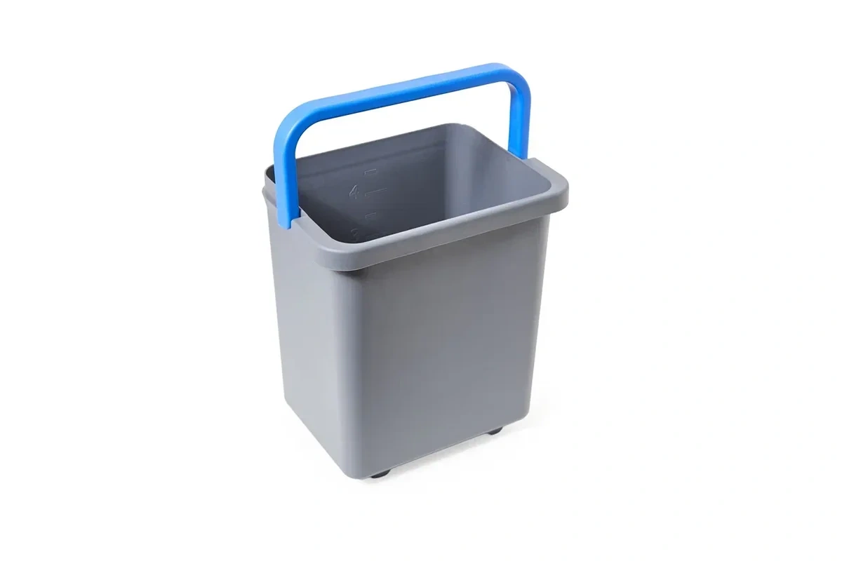 Серая поверхность маскирует загрязнения при длительной эксплуатации, а красная ручка служит элементом цветовой кодировки. Крышка открывается на 180 градусов, что облегчает доступ внутрь. На боковой стенке нанесена мерная шкала для точного разведения моющих растворов.