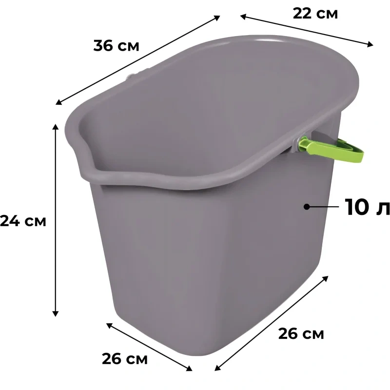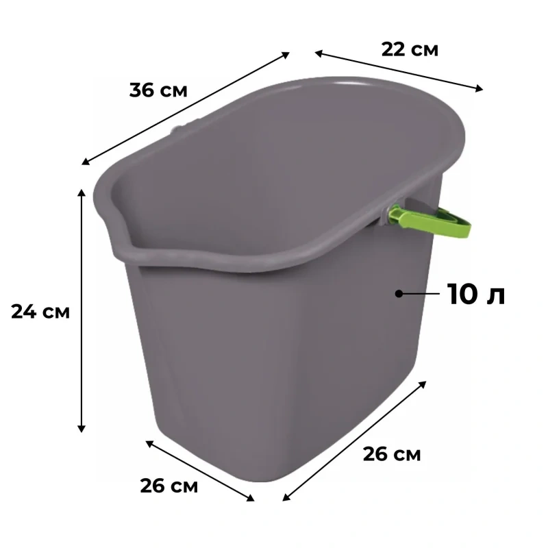 Размеры ведра по верхнему краю — 36×22 см, размер низа — 26.6×16 см, высота — 24 см. Вес ведра составляет 208 г. Ведро не имеет крышки и является универсальным хозяйственным изделием.