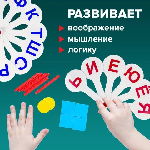 Набор содержит 2 веера с гласными и согласными буквами русского алфавита. Символы нанесены с двух сторон. Изготовлен из сертифицированного полипропилена. Размер - 230х195х17 мм. Поставляется в пакете с европодвесом.