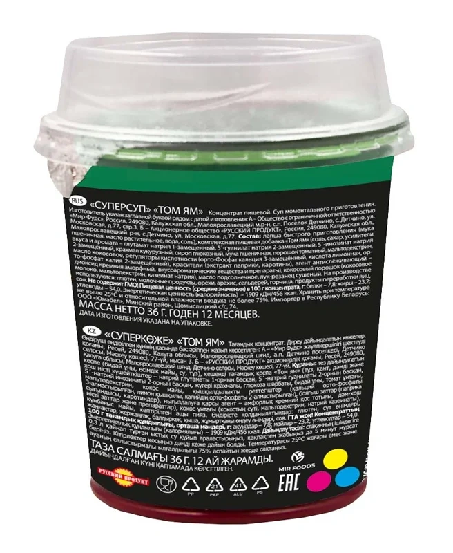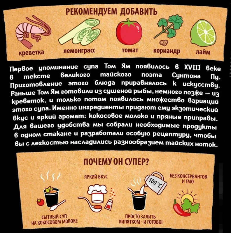 Бульон: домашний соль, усилители вкуса и аромата Е621, Е635, сахар, сушеные овощи и зелень (чеснок, лук репчатый, петрушка, укроп, пастернак), ароматизаторы, содержащие сельдерей и молоко, сушеные грибы (шампиньоны, белые грибы), пряности (перец черный, перец красный чили, лавровый лист), олеин пальмовый, экстракт дрожжей, красители сахарный колер IV, Е172.