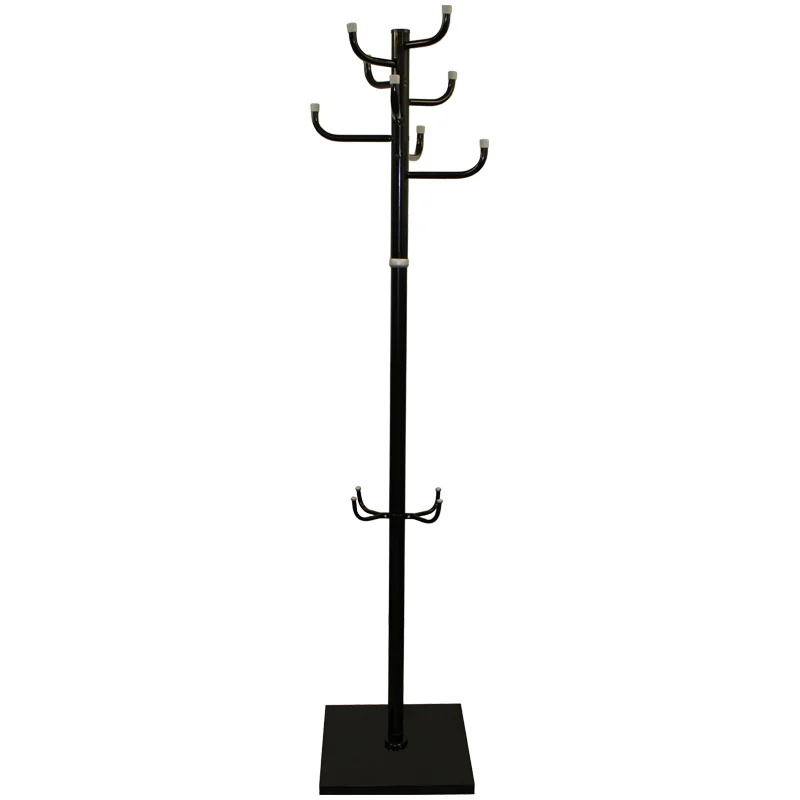Вешалка напольная выполнена из оцинкованной стали с полименым покрытием, утяжеленной квадратное основание, 8 крючков для верхней одежды равномерно распределены по окружности стойки диаметром 38 мм. Поставляется в разобранном виде, в картонной таре.