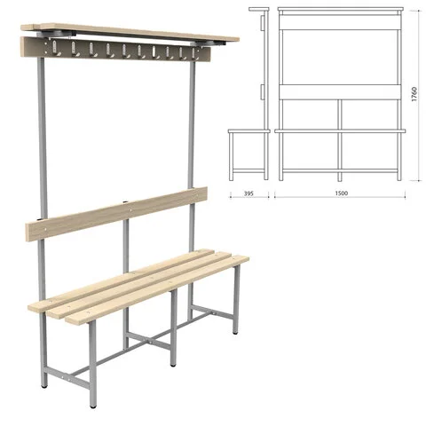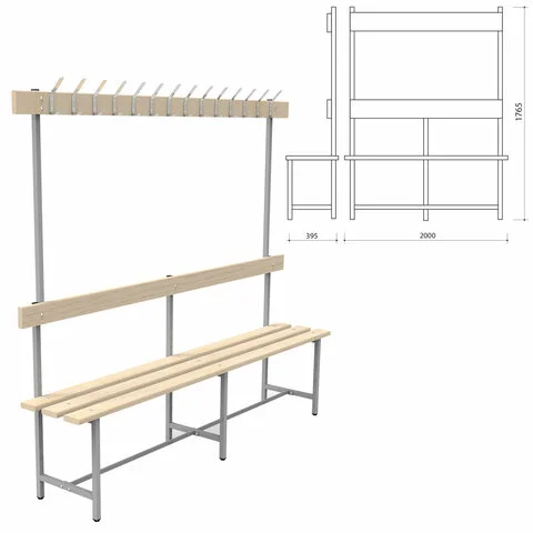 Скамья с вешалкой, спинкой 'СВТ 6', 1765х2000х395 мм, 14 крючков, каркас металлический серый, сидень