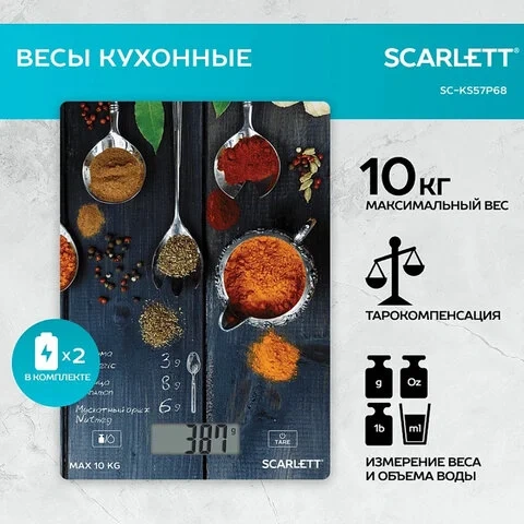 Весы кухонные SCARLETT SC-KS57P68, электронный дисплей, max вес 10 кг, тарокомпенсация, стекло