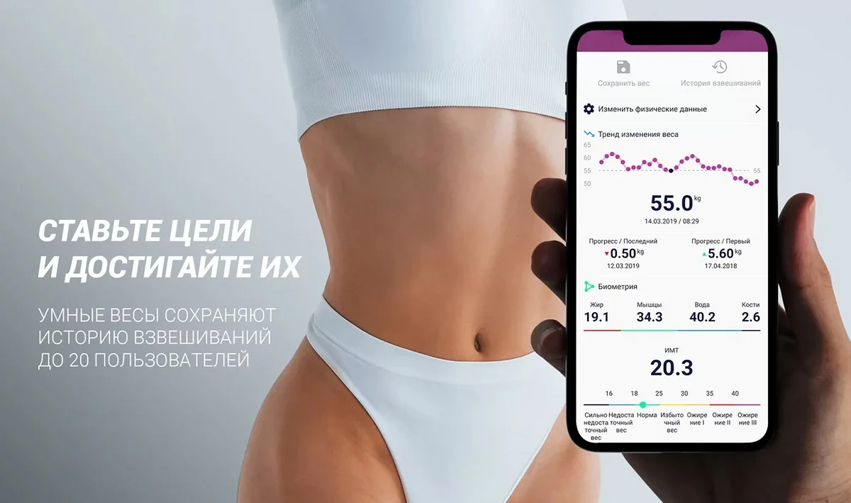 Отличаются высокой точностью, стильным дизайном и широким функционалом. Весы легко подключаются к телефону без дополнительного оборудования. Подключив весы к телефону, вы можете измерить не только свой вес, но и индекс массы тела, массу жира, мускулов, воды и костей (биоимпедансный анализ). В приложении также ведется история изменения массы тела. Историю изменения веса могут вести до 20 пользователей. Весы изготовлены из прочного закаленного стекла. Точность измерения веса достигается с помощью устойчивых прорезиненных ножек. Максимальный вес 200кг. Батарейки входят в комплект.