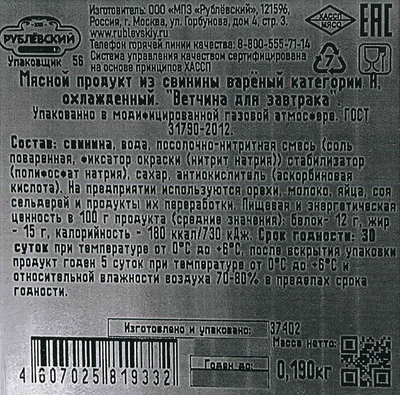 Ветчина Для завтрака бренда Рублёвскийсделана из нежирной свинины, имеет выраженную мясную текстуру. Сытный и вкусный продукт можно использовать не только для завтрака, а также для перекусов - аппетитные ломтики или бутерброды с ветчиной помогут быстро утолить голод. Приготовлена по бережно сохраненному советскому рецепту. Имеет срез аппетитного розового цвета с вкраплениями цельных кусочков свиного филе.