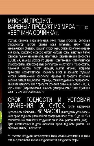 Использование рубленого мяса для производства ветчины Сочинка от бренда Стародворье позволяет получить характерный мраморный срез с крупными кусочками сочного окорока и делает консистенцию особенно сочной, а букет ароматных специй и чёрный перец подчёркивают вкус продукта. Отлично дополнит салаты и закуски, которые займут почетное место на любом столе. Из ветчины можно готовить не только праздничные блюда, но и самые что ни на есть повседневные: макароны или запеченную картошку, блинчики, омлеты и просто бутерброды.